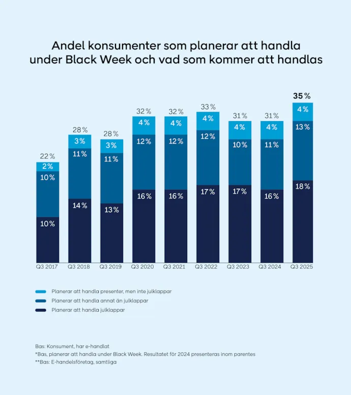 Kampanjperioder spelar en avgörande roll för hur konsumenter planerar och genomför sina inköp. Hela 35 procent av konsumenterna planerar att handla under Black Week, vilket slår det tidigare rekordet från pandemiåret 2020. Drivande i trenden är de unga. För prismedvetna konsumenter i åldern 18–29 år är kampanjer särskilt viktiga – hela 59 procent i denna grupp planerar sina inköp utifrån dessa perioder.